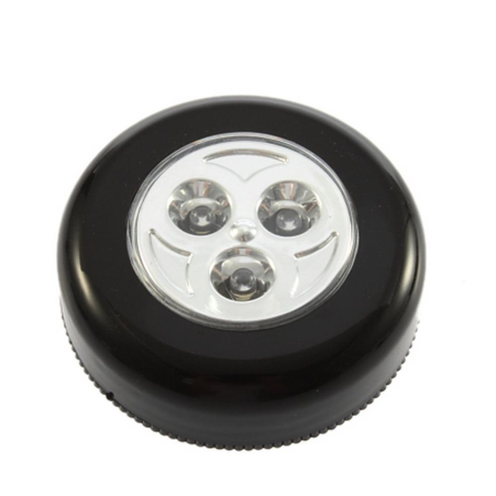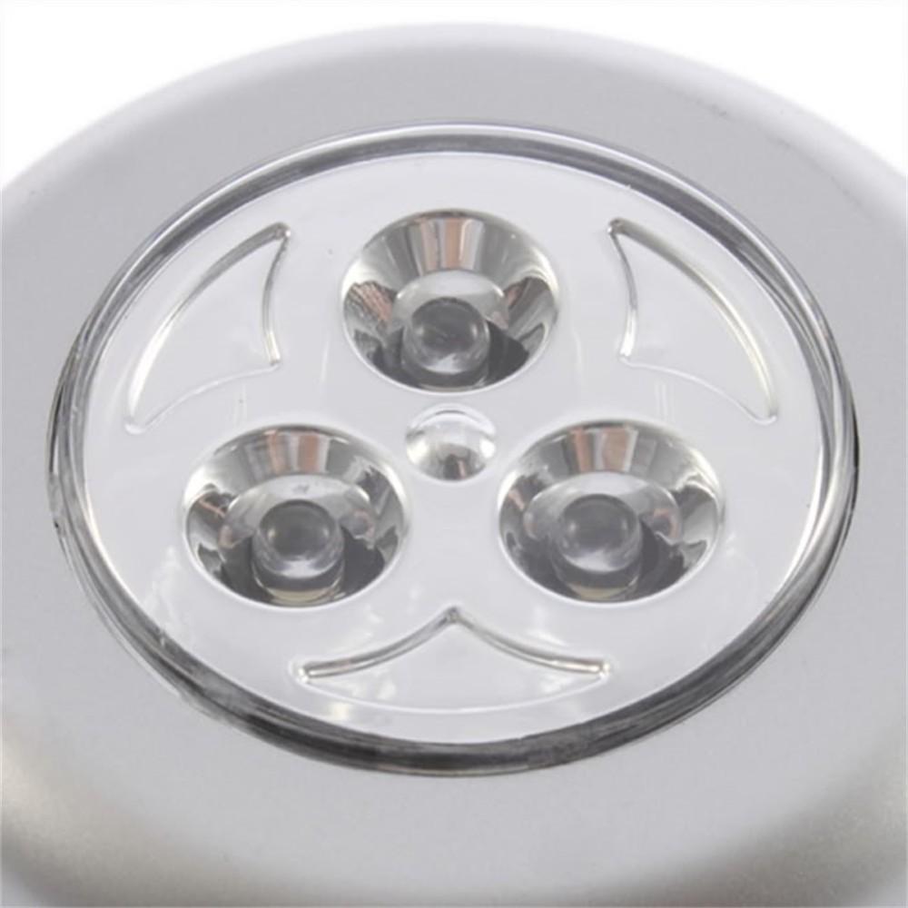 Set of 2 battery-operated stick-on tap lights with convenient tap-on/off technology Super-bright LEDs offer energy-efficient lighting and never need replacing Operates for up to 100 hours on 3 AAA batteries (not included) Silver-tones ABS plastic construction; includes adhesive strips for easy installation Each light measures 3"round X 1"tall.
