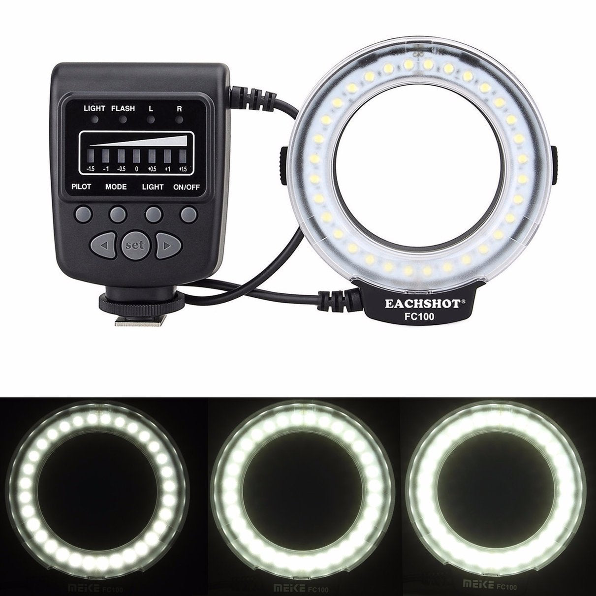 The Meike FC-100 is a ring type macro flash light designed particularly for close-up, medical, scientific, forensic photography, etc. Built with 32 pieces of high-intensity LED's, this Meike macro ring flash illuminates the subject, no matter how low the lighting conditions are. You can use this LED flash light as an instant flash or for non-stop light photo shooting, which is mainly required in close-up photography. Equipped with pre-flash system, this Meike macro ring flash allows you to turn on either full illumination or partial illumination, depending on the lighting situation.